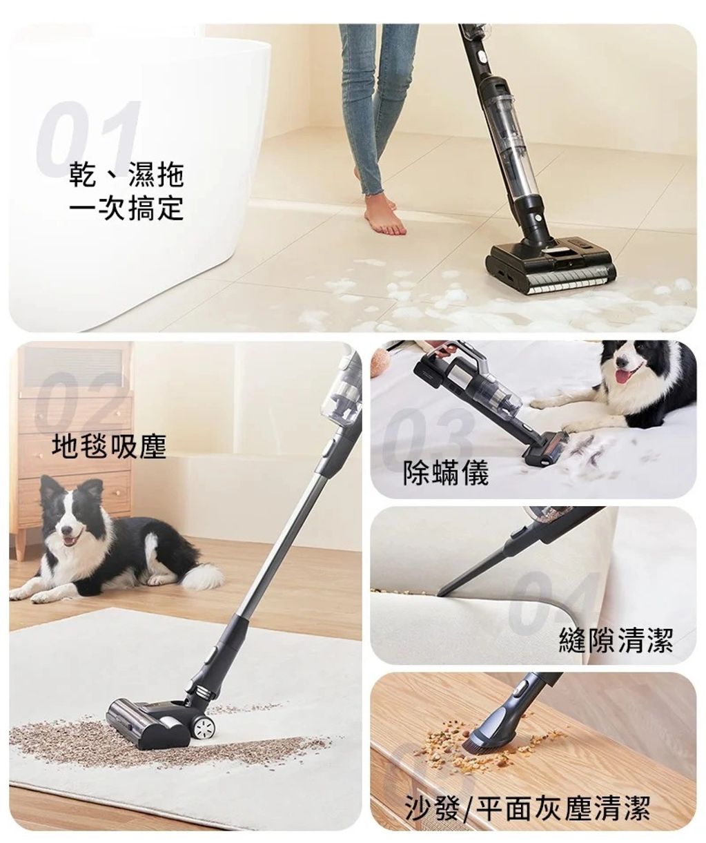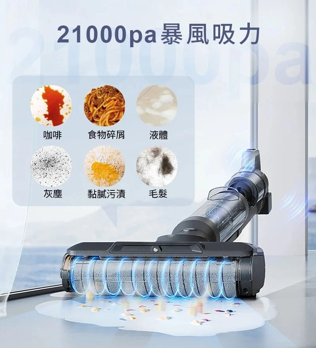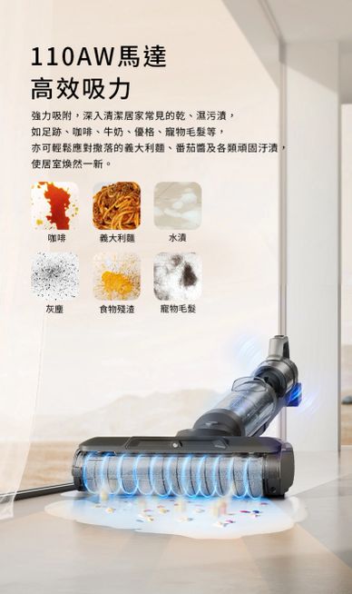 強大的吸力可深層清潔家中常見的乾濕污漬,如腳印、咖啡、牛奶、優格、寵物毛髮等。