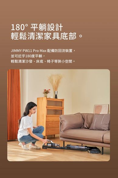 JIMMY PW11 Pro Max配備防倒流裝置,可平放180°,輕鬆清潔沙發、床、椅角等底部狹小空間