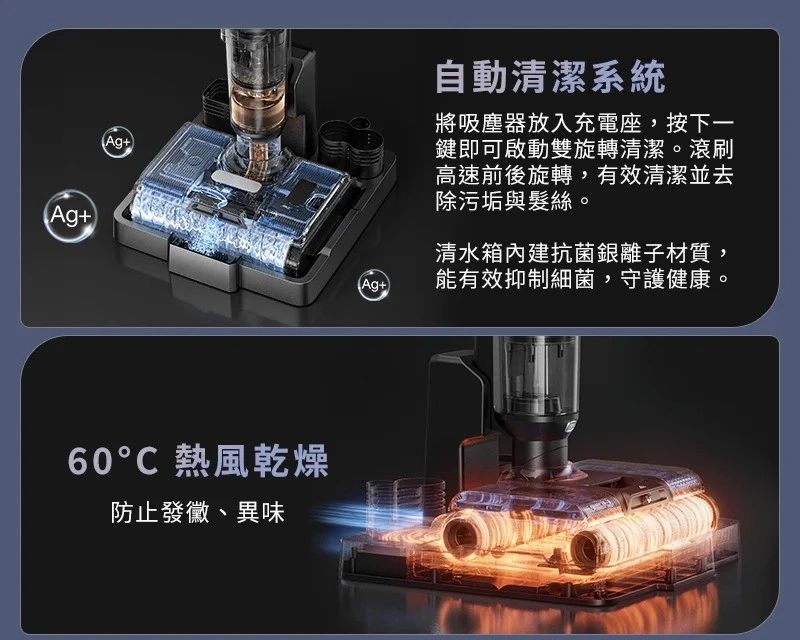 只需將吸塵器放在底座上,按下按鈕即可進行雙旋轉清潔,使刷子高速向前和向後旋轉,以更好地清潔並去除麻煩的污垢和頭髮。淨水箱內置抗菌銀離子材料,在淨水中產生抗菌銀離子,長期照顧健康。